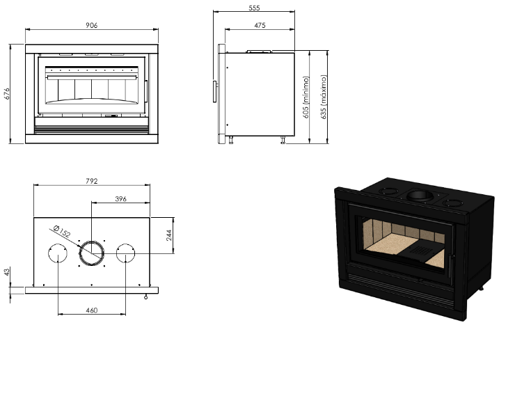 Lareira de dupla combustão em aço carbono. Capacidade de aquecimento 320m³.